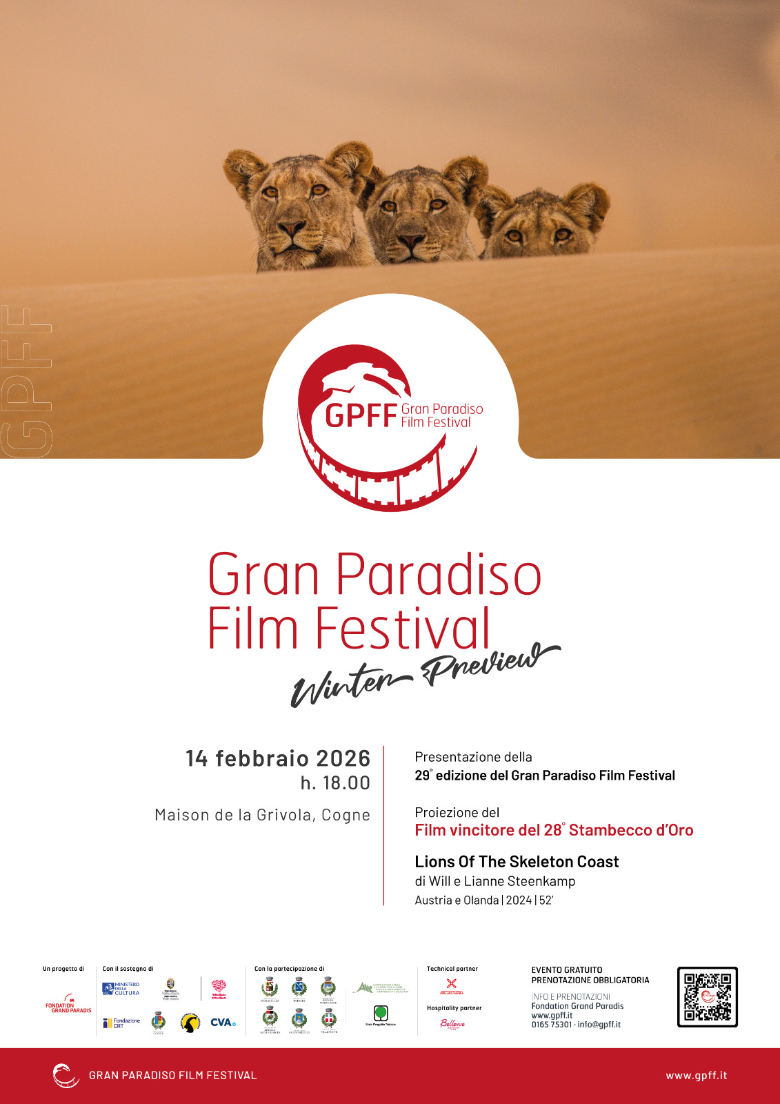 Mentre Cogne indossa il suo abito invernale, il cinema si scalda con le immagini del deserto namibiano: Fondation Grand Paradis propone, all’interno del programma della serata, la proiezione di “Lions of the Skeleton Coast” di Will e Lianne Steenkamp, film pluripremiato alla 28ma edizione del Gran Paradiso Film Festival, dove ha ottenuto il Premio Stambecco d’Oro, il Premio Stambecco d’Oro Junior, il Premio alla Miglior Sceneggiatura (Giuria tecnica) e il Premio GPFF Online. Il film racconta la storia di tre leonesse della Namibia, seguendone il viaggio lungo una delle coste più selvagge dell’Africa. Nel corso degli anni, le giovani protagoniste affrontano la lotta per la sopravvivenza nella remota Skeleton Coast, adattandosi a un ambiente estremo e scoprendo strategie sorprendenti per vivere e cacciare lungo il litorale. Ne emerge la natura come autentica maestra: nella sua forza e nelle sue fragilità, offre preziose chiavi di lettura per comprendere il nostro tempo. In questo spazio di ascolto e confronto, il Gran Paradiso Film Festival si conferma un luogo privilegiato in cui accogliere e condividere tali insegnamenti.