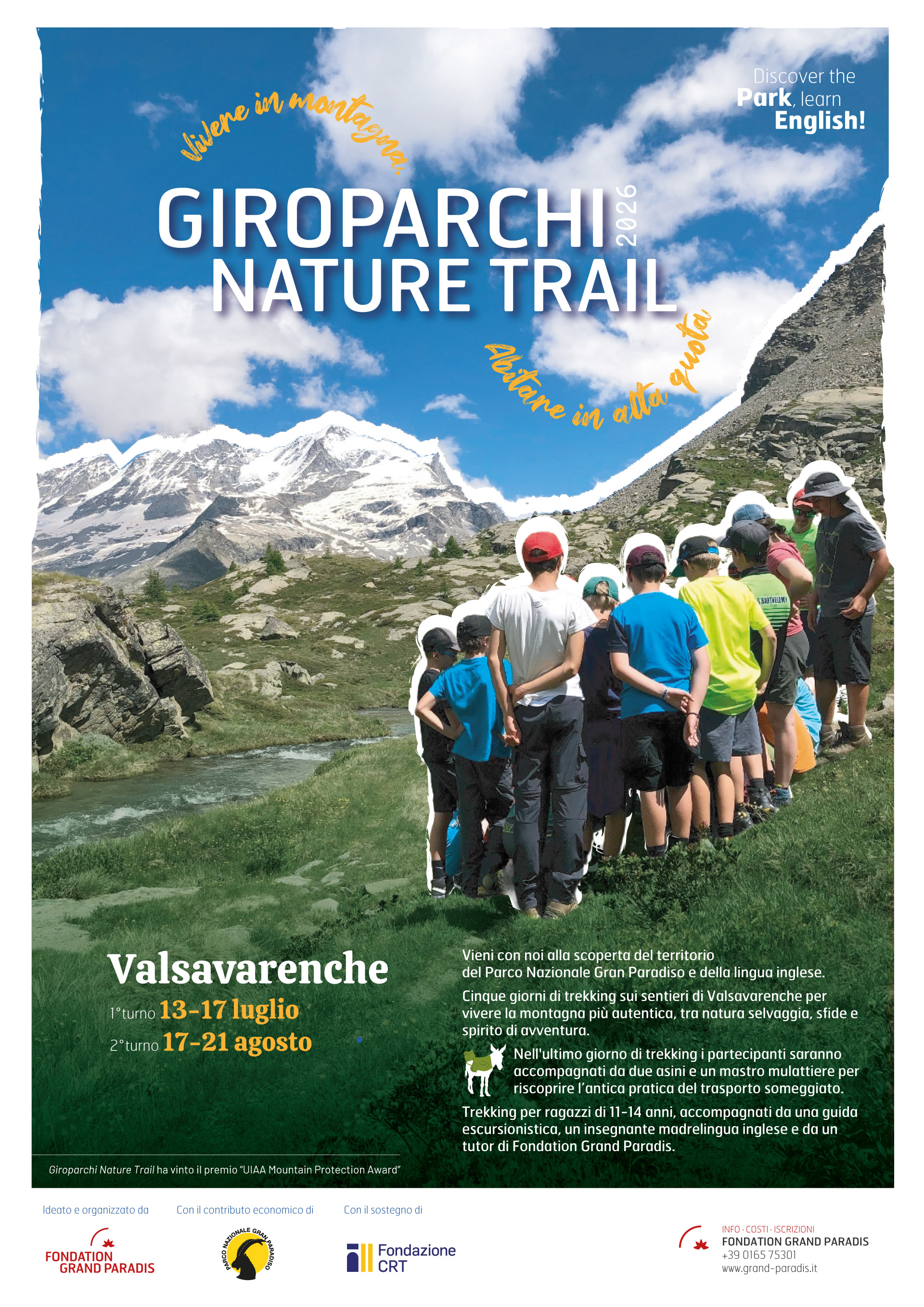 Fondation Grand Paradis apre le iscrizioni alla 14ma edizione di Giroparchi Nature Trail, il trekking naturalistico in lingua inglese per ragazze e ragazzi dagli 11 ai 14 anni, vincitore del premio UIAA Mountain Protection Award, che quest’anno si articolerà sul tema “Vivere in montagna: abitare in alta quota”.
