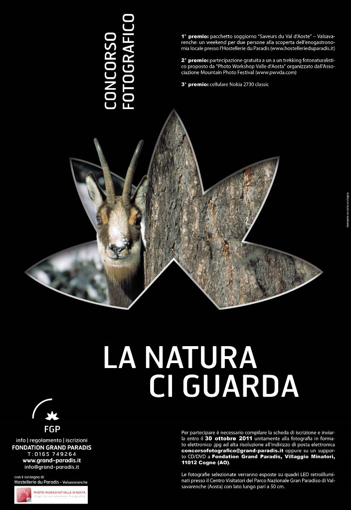 La natura ci guarda è il terzo concorso fotografico promosso da Fondation Grand Paradis con l’obiettivo di promuovere la conoscenza e il confronto tra gli ambienti di montagna. Le precedenti edizioni dei concorsi fotografici Fondation Grand Paradis, Dans les yeux, dans les eaux e Sogni e Risvegli, hanno visto la partecipazione di oltre 450 fotografie arrivate da tutta Europa. Le fotografie selezionate nell’ambito dei concorsi vengono esposte presso il Centro Visitatori del Parco Nazionale Gran Paradiso di Valsavarenche e pubblicate sul sito web www.grand-paradis.it.
