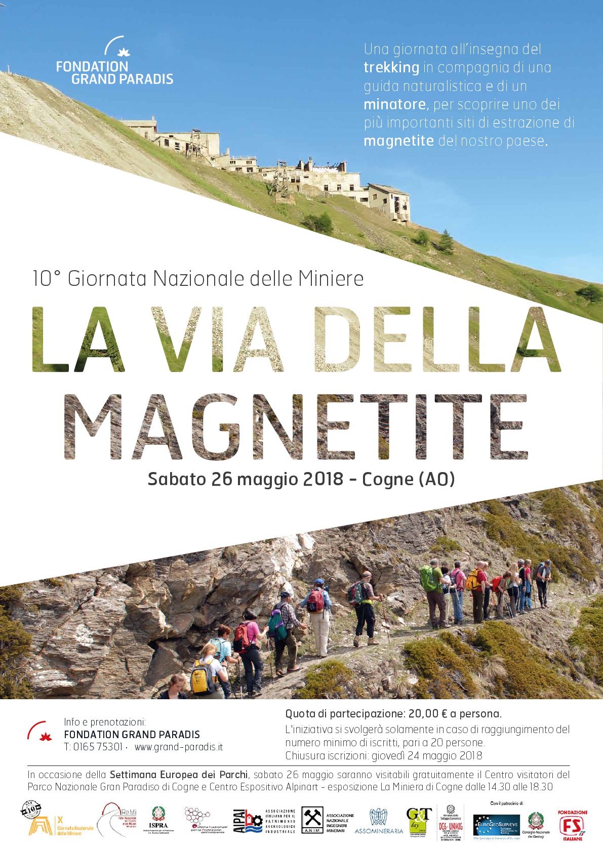 Sabato 26 maggio 2018 sarà una giornata dedicata al patrimonio minerario, storico, culturale e naturalistico della Valle di Cogne: l’iniziativa principale sarà “La Via della magnetite”, il trekking alla scoperta di uno dei più importanti siti di estrazione di magnetite del nostro paese: le miniere di Cogne. L’iniziativa è organizzata da Fondation Grand Paradis nell’ambito della 10° Giornata Nazionale delle Miniere, manifestazione promossa in tutta Italia da REMI ISPRA-SNPA, ANIM, ASSOMINERARIA e G&T con il Patrocinio di Consiglio Nazionale dei Geologi, EuroGeoSurveys e la Fondazione FS per valorizzare il turismo geologico.