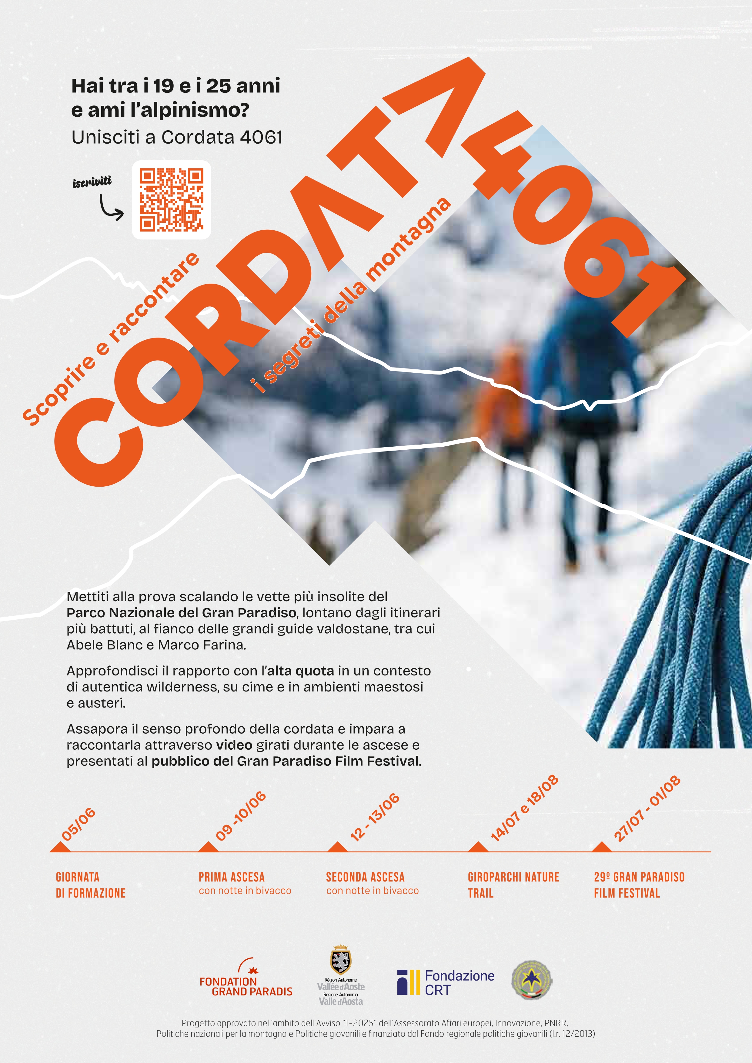 Cordata 4061 è il nuovo progetto di Fondation Grand Paradis, realizzato con il contributo della Regione autonoma Valle d’Aosta, rivolto a ragazze e ragazzi tra i 19 e i 25 anni, residenti in Valle d’Aosta e con una già consolidata esperienza alpinistica. L’iniziativa combina alpinismo e narrazione: due sfide che uniscono tradizione e innovazione contribuendo a trasformare la montagna in un luogo di sperimentazione.