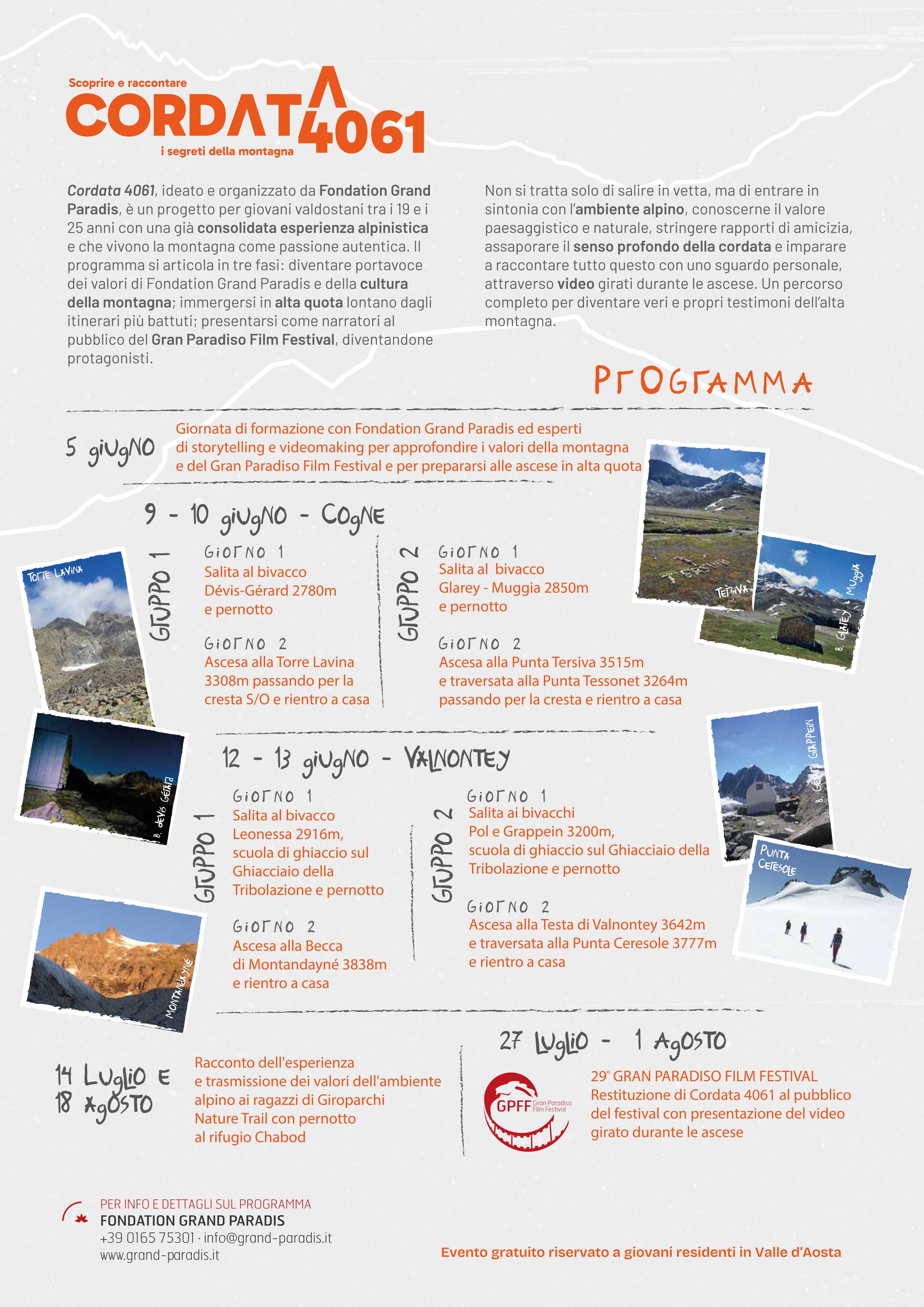 Il programma prevede una prima giornata di formazione a cura di Fondation Grand Paradis, venerdì 5 giugno presso il Villaggio Minatori di Cogne, durante la quale i partecipanti, accompagnati da professionisti esperti di storytelling del territorio e di videomaking, approfondiranno i valori della montagna e del Gran Paradiso Film Festival e si prepareranno alle ascese, previste nelle giornate del 9-10 giugno e del 12-13 giugno. Per l’esperienza in quota il gruppo di partecipanti, selezionati da un’apposita commissione, verrà suddiviso in due sottogruppi di 6 persone, ciascuno condotto da 2 guide. Il primo gruppo seguirà questo percorso: prima ascesa con partenza il 9 giugno da Lillaz con pernotto al bivacco Dévis-Gérard (2.780 m s.l.m), il giorno dopo salita alla Torre Lavina (3.308 m s.l.m.) passando per la cresta S/O e rientro a casa; seconda ascesa con partenza il 12 giugno dalla Valnontey con pernotto al bivacco Leonessa (2.916 m s.l.m.) e scuola di ghiaccio sul Ghiacciaio della Tribolazione, il giorno seguente salita alla Becca di Montandayné (3.838 m s.l.m.) e rientro a casa. Il secondo gruppo invece seguirà questo percorso: prima ascesa con partenza il 9 giugno da Gimillan con pernotto al bivacco Glarey-Muggia (2.850 m s.l.m), il giorno seguente salita alla Tersiva (3.515 m s.l.m) e traversata alla Punta Tessonet (3.264 m s.l.m.) passando per la cresta e rientro a casa; seconda ascesa con partenza il 12 giugno dalla Valnontey con pernotto ai bivacchi Pol e Grappein (3.200 m s.l.m.) e scuola di ghiaccio sul Ghiacciaio della Tribolazione, il giorno seguente salita alla Testa di Valnontey (3.642 m s.l.m.) con traversata alla Punta di Ceresole (3.777 m s.l.m.) e rientro a casa.